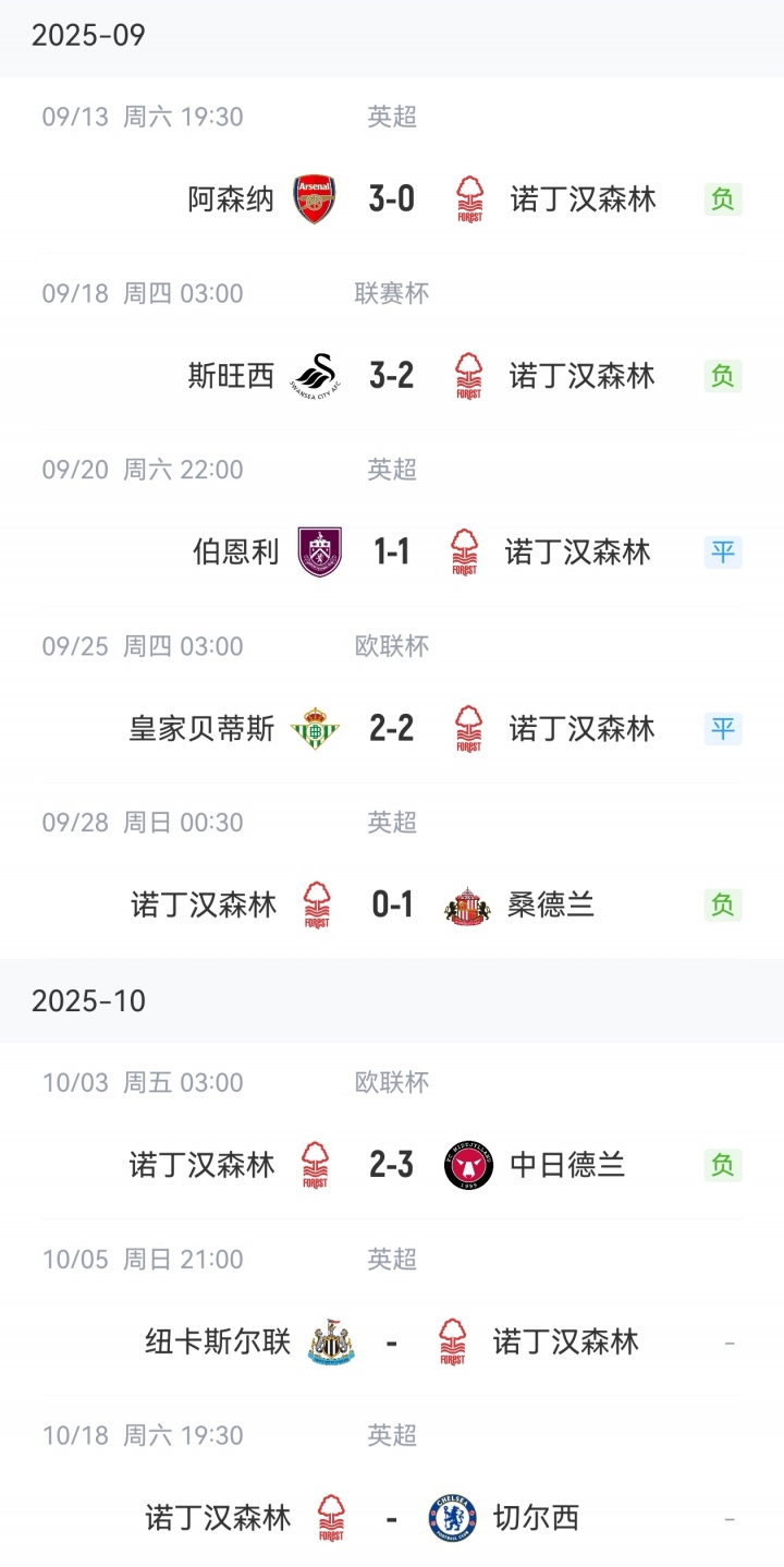诺丁汉森林赛程: