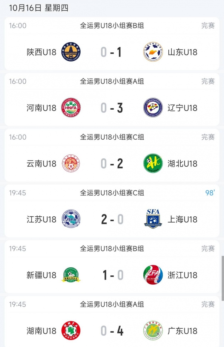 今日运会男足U18组赛果:广东、辽宁、山东均取胜,上海不敌江苏
