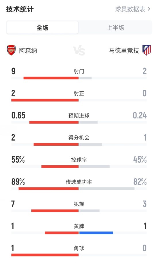 阿森纳半场0-0马竞数据:射球 9-2,射正2-0,盘带时间 55%-45%