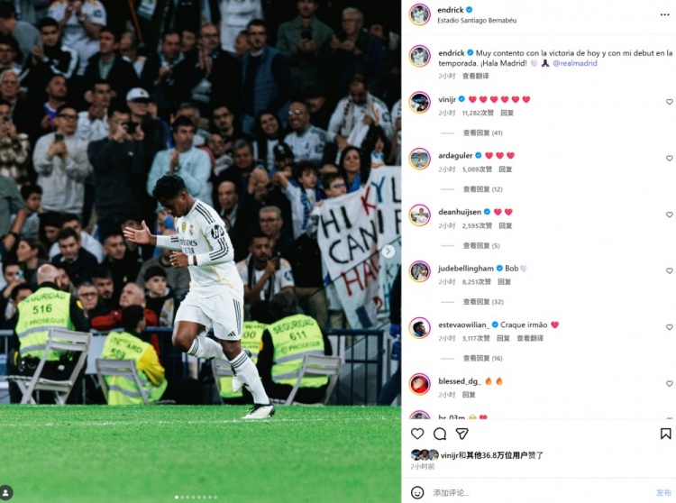 恩德里克社媒晒后备 登场照:很高兴赢下获胜 并完成本赛季首秀