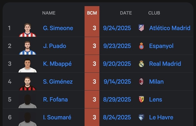 9月25日讯 Stat Muse统计了五大职业联赛 单场错失重大机会最多的球员,有六人单场错失3次重大机会,并列第一。