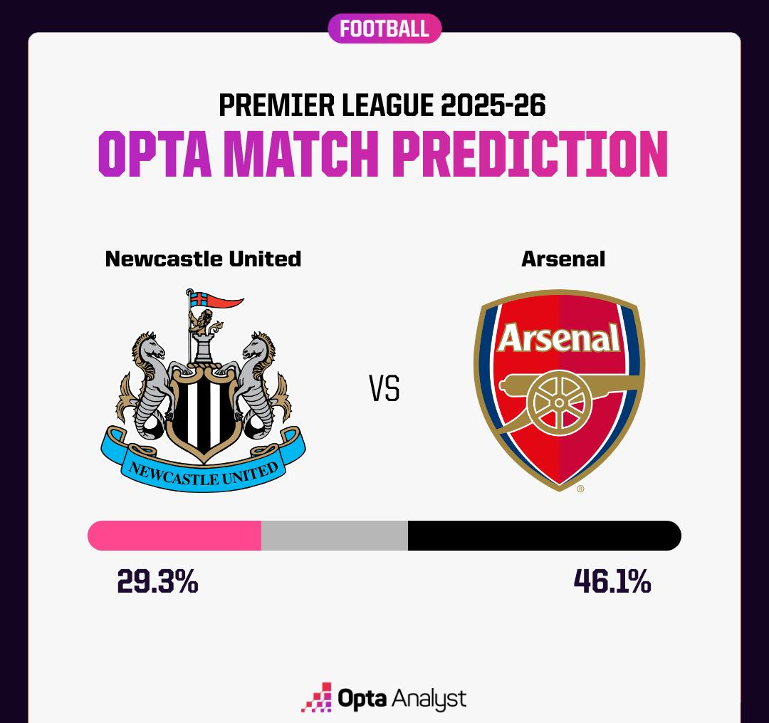 至少,Opta还是更倾向于支持客队--纽卡胜,29.3%;阿森纳胜,46.1%;双方平手 ,24.6%。