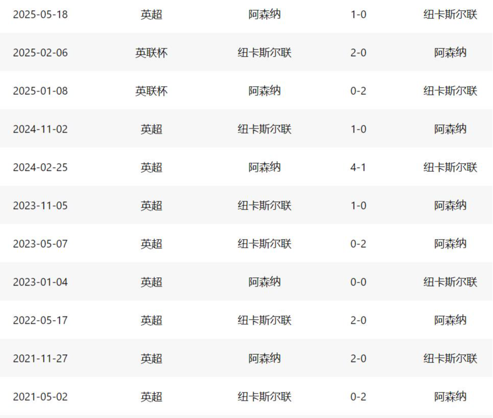 在职业联赛 层面的交锋,双方近12场阿森纳取得8胜1平3负的成绩。在圣詹姆斯公园运动活动 场 的近12次职业联赛 对话中,阿森纳也以8胜4负的成绩占据明显优势。只不过,阿森纳上一次客胜纽卡,也已经是23年5月份的事情了。