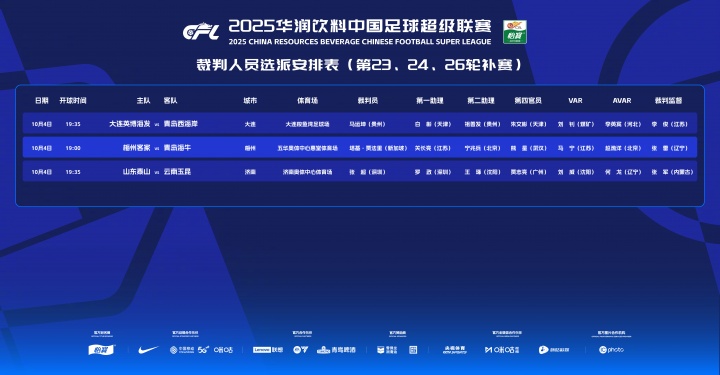 青岛西海岸vs大连英博本场赛事 主裁判 为马运坤,VAR裁判 刘钊。