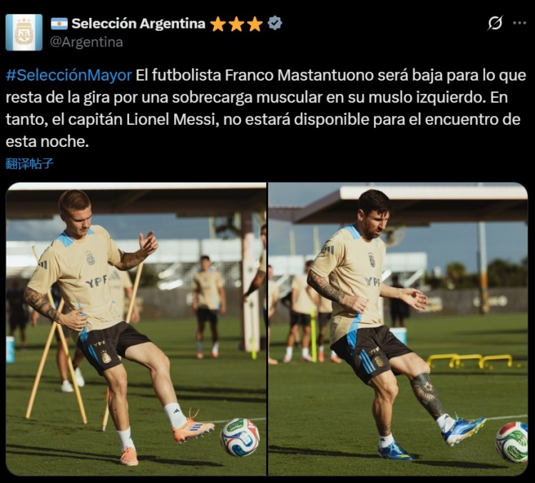 阿根廷官方:马斯坦托诺肌群 疲惫 退赛本期集训,梅西缺席今日赛事