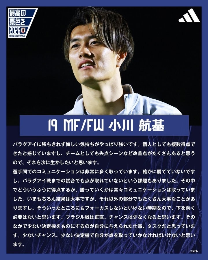 10月13日讯 日本国家队官推更新,晒出昨日练习 后部分球员接受采访的内容,其中上一场攻破巴拉圭大门的小川航基接受了采访,对与巴西队的赛事 进行展望。