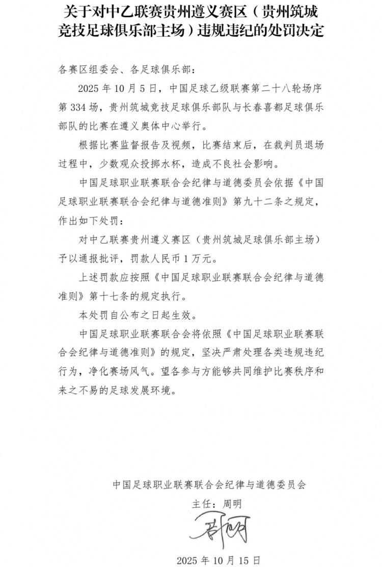 10月15日讯 因观赛人群 向裁判 抛掷 水杯,中乙职业联赛 贵州筑城俱乐部主场作战 被中足联罚款1万元。