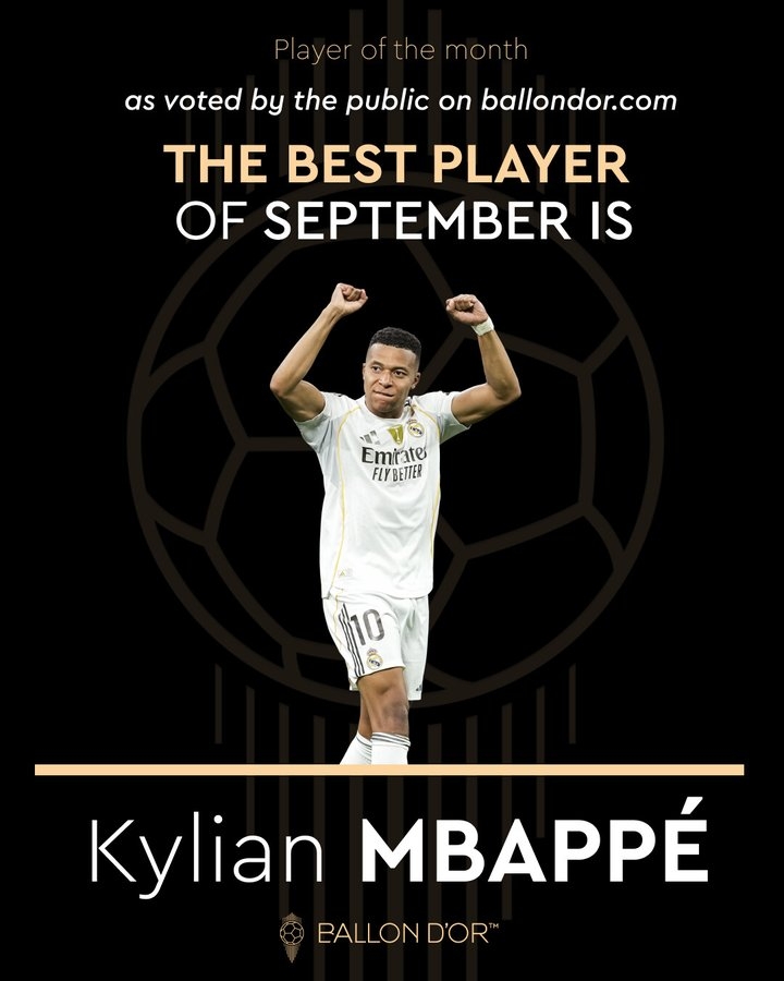 11月01日讯 金球奖官方消息,姆巴佩当选金球奖9月份最佳球员。