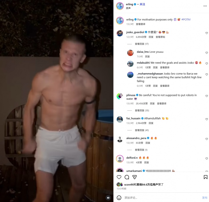 11月03日讯 本轮英超曼城3-1击败伯恩茅斯,哈兰德双响将职业联赛 得分 数提升至13个,赛后他社媒晒视频,展现了自己的自律。
