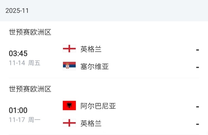 英格兰11月赛程↓